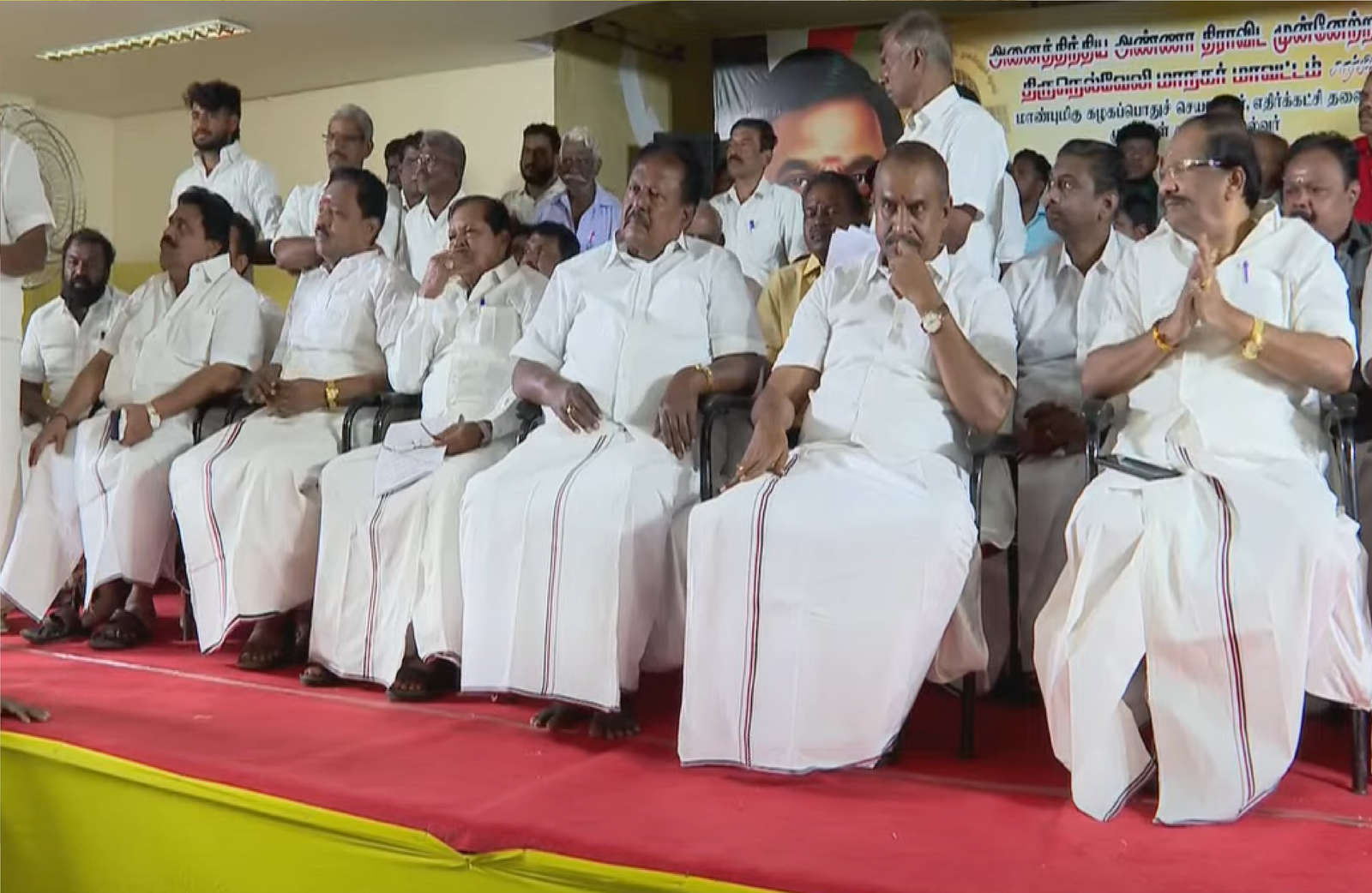 இவ்வாறு அவர் பேசியதும், மாவட்ட செயலாளர் ஆதரவாளர்கள் ஆத்திரமடைந்து பாப்புலர் முத்தையாவுக்கு எதிராக கோஷம் எழுப்பினர். அமமுகவிற்கு சென்று வந்தவர்கள் எல்லாம் பேசுவதற்கு அருகதை கிடையாது என்று கூறினர். இதனால் பாப்புலர் முத்தையா ஆதரவாளர்களுக்கும், மாநகர் மாவட்ட செயலாளர் தச்சை கணேசராஜா ஆதரவாளர்களுக்கும் இடையே கைகலப்பு ஏற்பட்டது. ஒருவரையொருவர் தாக்கிக் கொண்டனர். இதனால் கூட்டம் போர்க்களம் போல் காட்சியளித்தது. கூட்டத்தில் நிர்வாகிகள் மோதலை பார்த்து அதிர்ச்சியடைந்த மாஜி அமைச்சர் வேலுமணி, தகராறு செய்பவர்கள் வெளியே செல்லலாம், கட்சி விரோத நடவடிக்கையில் ஈடுபடுபவர்கள் மீது கடும் நடவடிக்கை எடுக்கப்படும் என்று மைக்கில் எச்சரிக்கை விடுத்தார்.